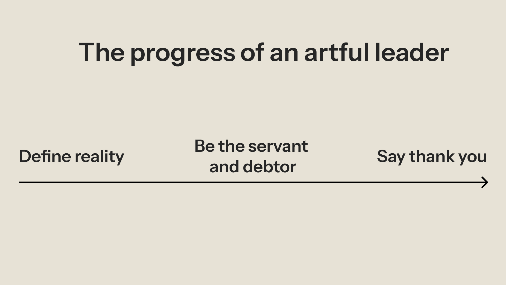 "The first responsibility of a leader is to define reality. The last is to say thank you. In between the two, the leader must become a servant and a debtor. That sums up the progress of an artful leader." ― Max DePree