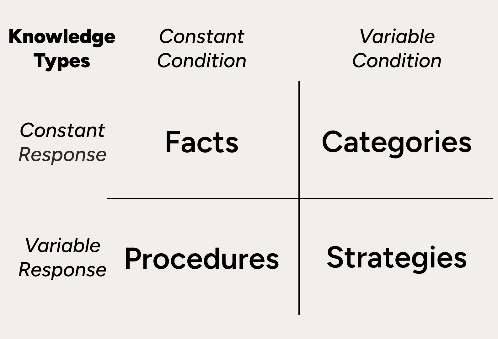 Knowledge Components Taxonomy: Knowledge can be categorized by four key features: constant or variable application conditions, constant or variable responses, verbal or non-verbal expression, and rationalized or memorized understanding.