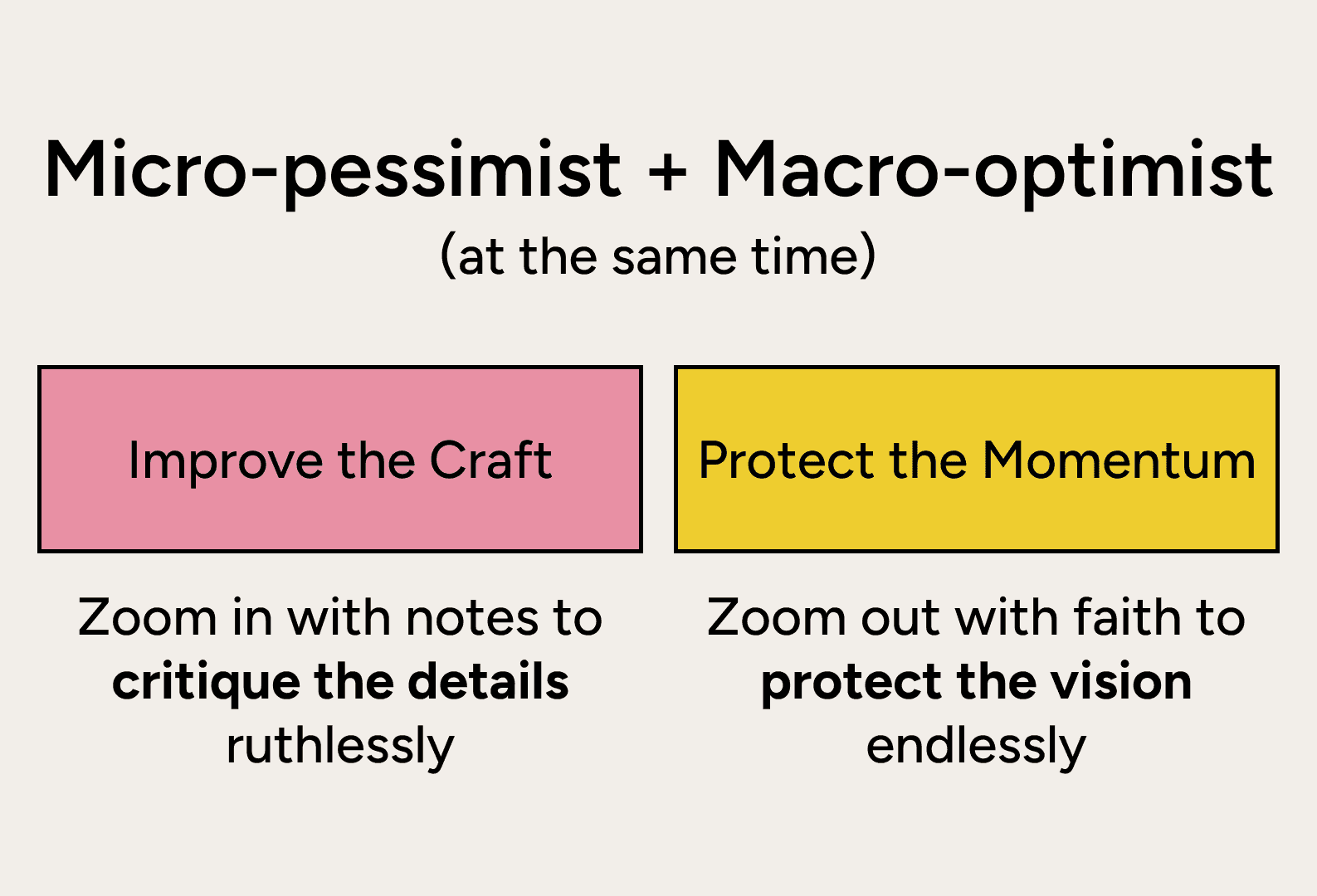 Zoom in with notes to improve the craft, zoom out with faith to protect the momentum. Be a micro-pessimist to critique the details ruthlessly and a macro-optimist to protect the vision endlessly.