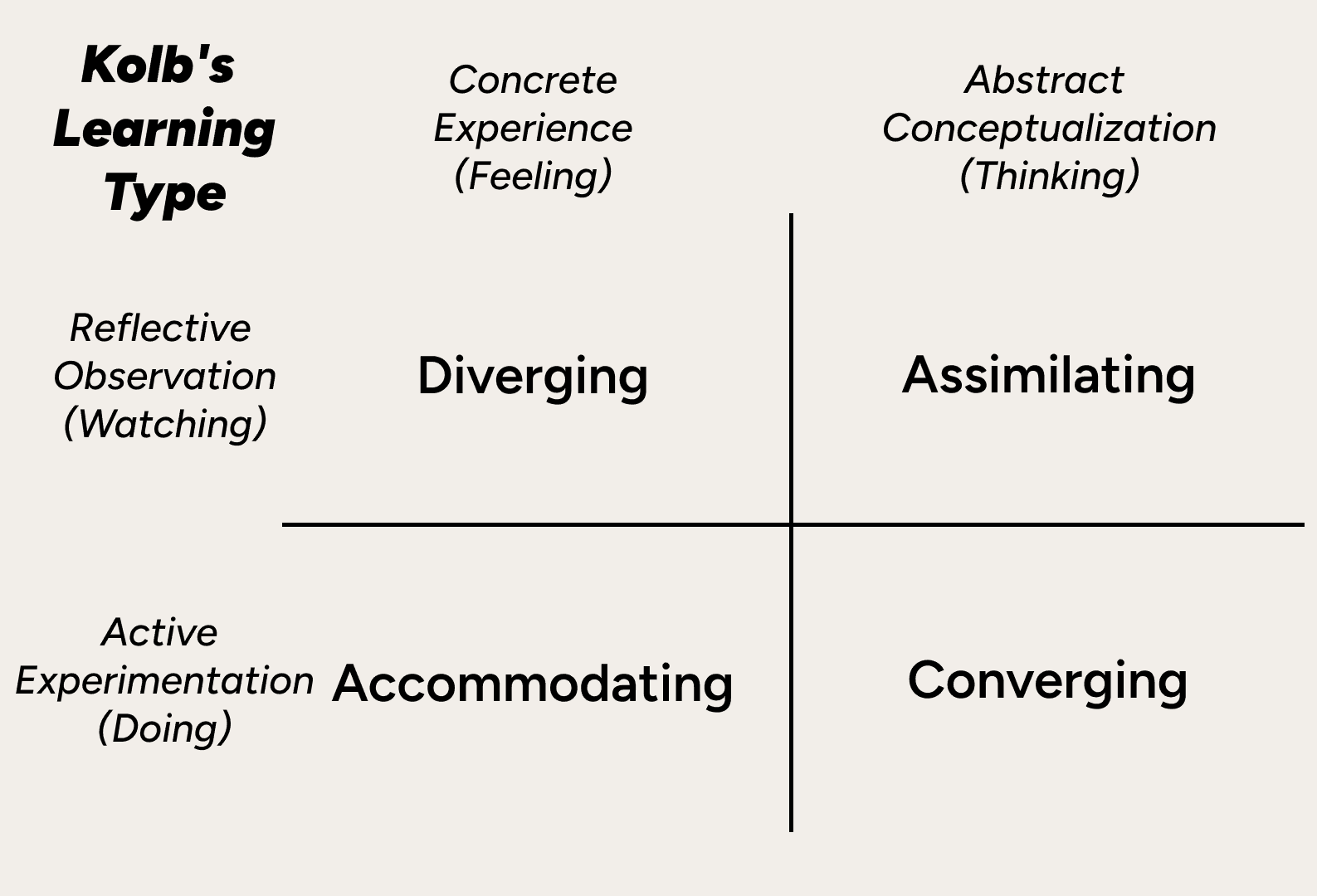 Kolb's Four Learning Styles: People learn differently based on how they approach tasks (doing vs. watching) and how they process experiences (thinking vs. feeling). These create four types: Diverging, Assimilating, Converging, and Accommodating.